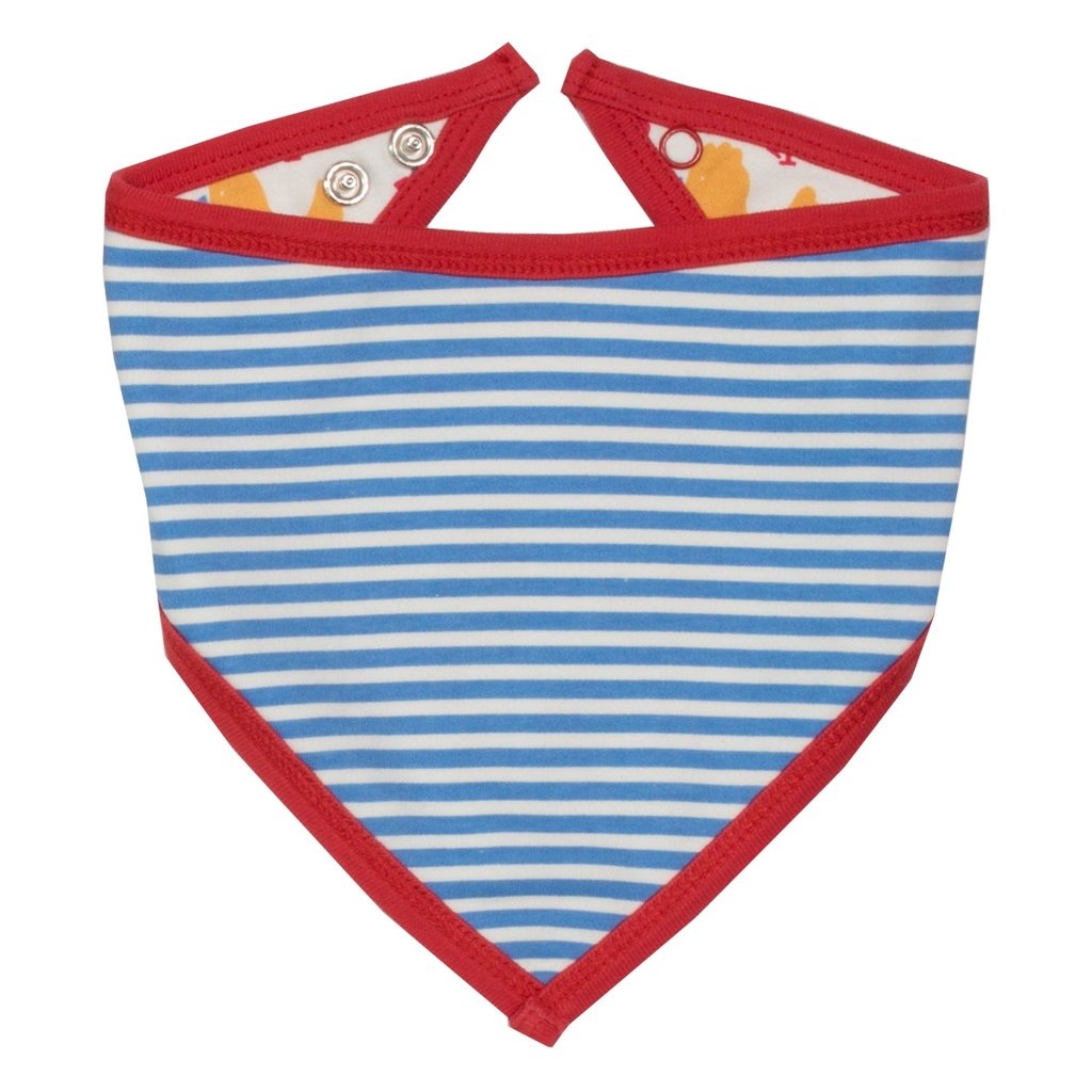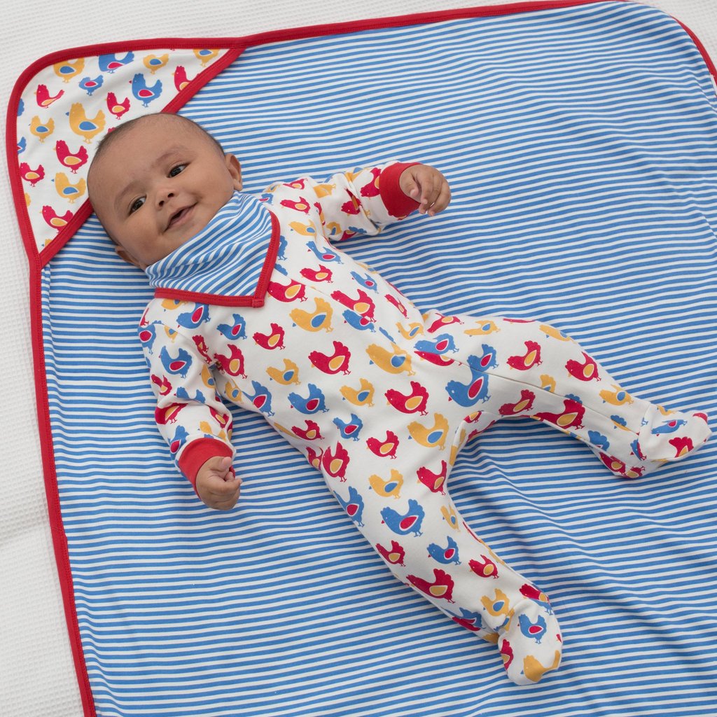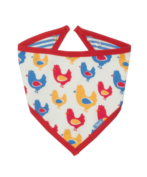This chicken bandana bib has a colourful print on one side and lovely stripe on the other this adjustable popper fastening organic cotton bandana bib is a super useful little accessory.
